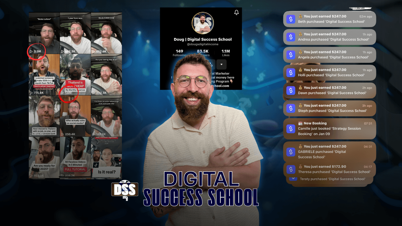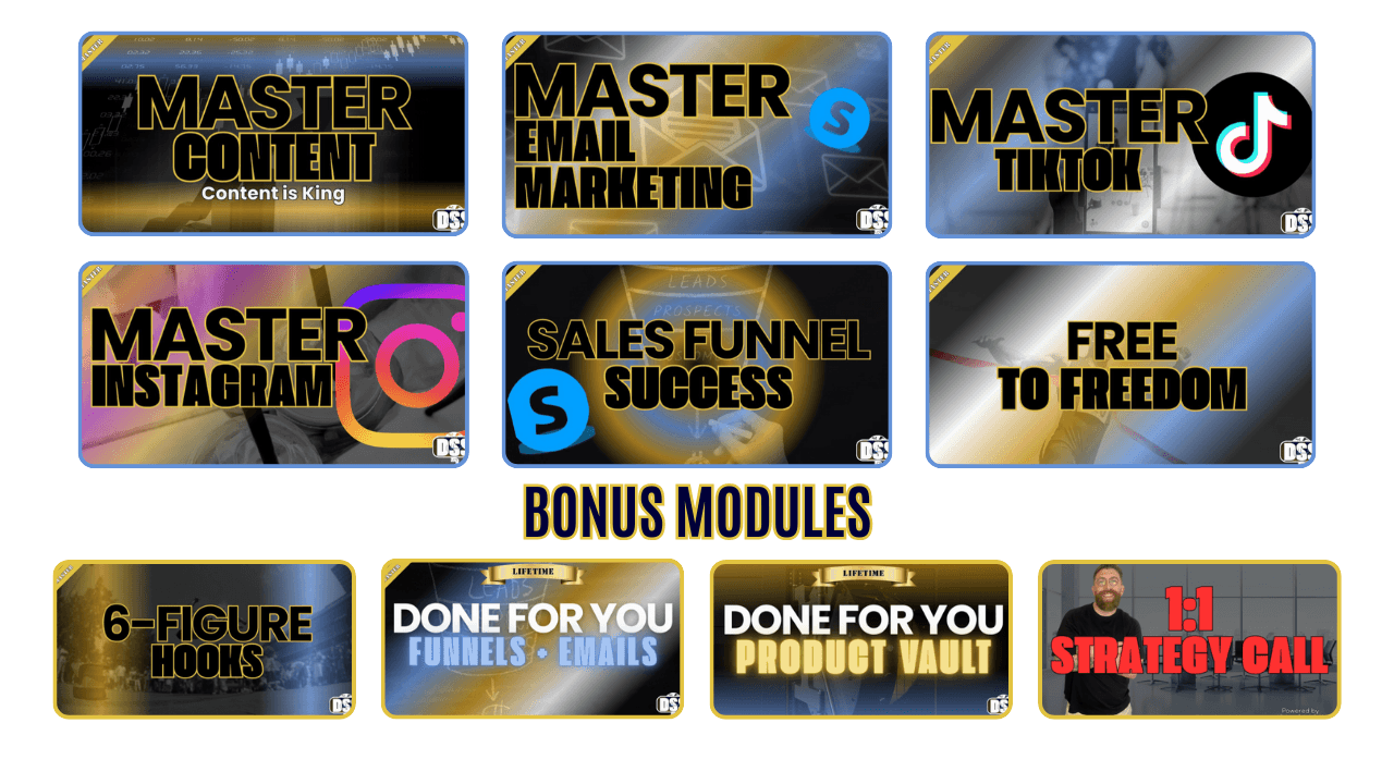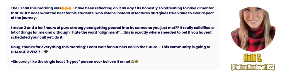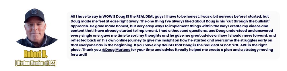 Most courses give information and leave you on your own. DSS focuses on clarity, execution, and support. Every lesson has a purpose, the curriculum is structured in order, and you get hands-on guidance instead of being left to figure things out alone. You also have access to 2 Live Coaching Calls per week, and an included 1-on-1 call with Doug Martone as a Lifetime Member. You will never feel lost or stuck.
